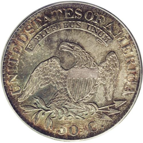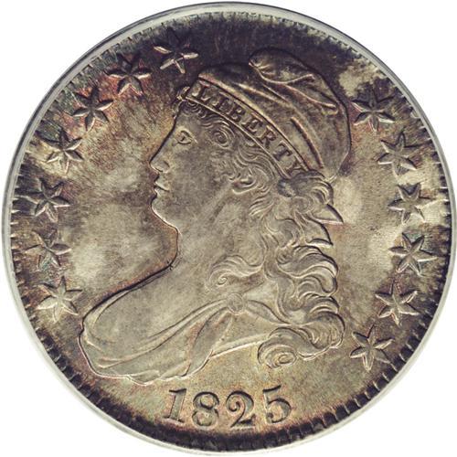 <B>1825<50C> MS64 PCGS.</B></I> O-102, R.1. A plentiful variety in all grades, including Mint State and Choice Mint State grade levels. This is a splendid example with fully lustrous surfaces beneath intermingled ivory, gold, russet, blue, and rose colors on each side. Obvious doubled profile features are visible, especially along Liberty's neck. Not so obvious are tripled profile features, visible only with strong magnification.