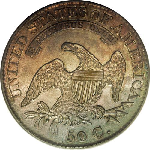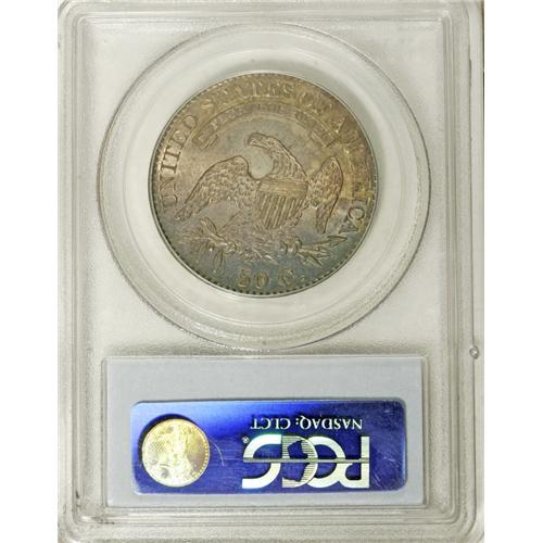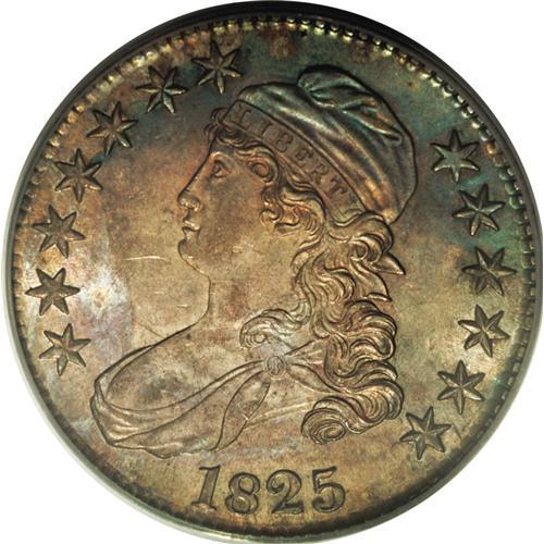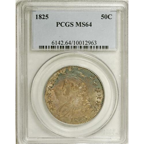 <B>1825 50C MS64 PCGS.</B></I> O-110, R.2. Liberty's mouth is visibly open on this variety and the 8 in the date leans noticeably to the right. The reverse of this variety, which is shared with the O-109, can be distinguished by the I in PLURIBUS directly under the junction of the AT in STATES, where the large A almost touches the second T. The design elements are sharply struck and well centered on the planchet. Most of the dentils show on both sides. Golden-gray patination dominates, and is accented by blushes of electric-blue and lavender. Minute contact marks are noted on Liberty's cheek, neck, and chest, and in the left obverse field.<BR><BR><b>Shipping:</b> Coin/Currency (<a target="_blank" href="http://www.heritageauctions.com/common/shipping.php">view shipping information</a>)