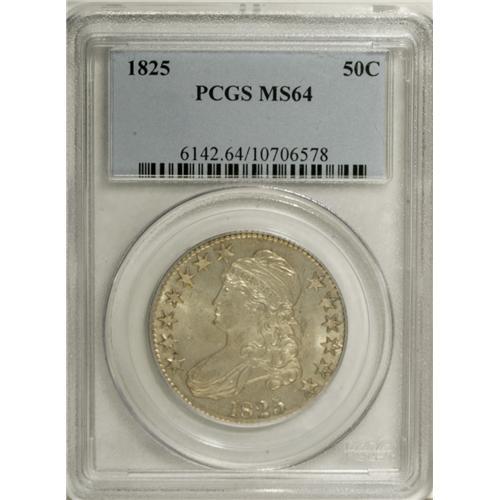 <B>1825 50C MS64 PCGS.</B></I> O-113, R.1. The stars are large, flat, and close to the milling. The 2 in the date has a short, sharp point. On the reverse the I in the motto is centered below the left side of the T in STATES. This example is basically brilliant, with light silver-gold patina on each side. There are few mentionable distractions, and perhaps only the subdued luster prevents a Gem grade.<BR><BR><b>Shipping:</b> Coins & Currency (<a target="_blank" href="http://www.heritageauctions.com/common/shipping.php">view shipping information</a>)