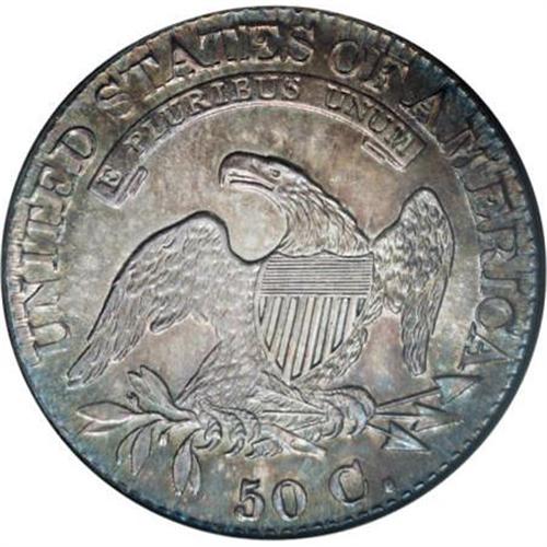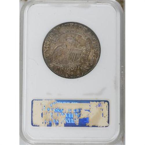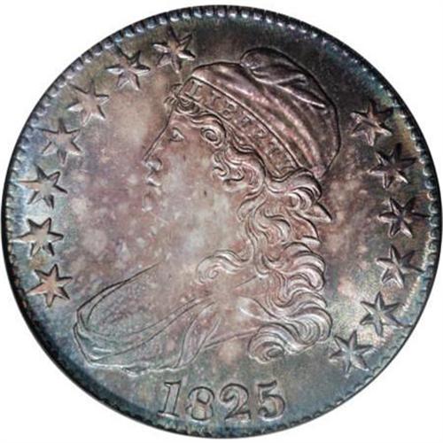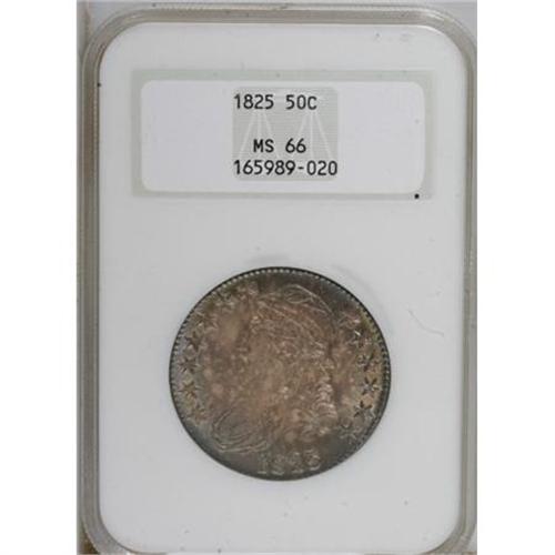 <B>1825 50C MS66 NGC.</B></I> O-110, R.2. This remarkable Premium Gem is beautifully toned in mottled tan-gold, apple-green, and plum-mauve. Satin luster sweeps the unabraded fields and devices. Crisply struck aside from the first five stars. Liberty's profile is strike doubled. A late die state for this nondescript variety, with the stars and other peripheral elements drawn toward the rims. Both dies held up without cracks until the obverse die was replaced to produce the rare O-109 variety. Housed in a former generation holder. Census: 22 in 66, 4 finer (9/07).<BR><BR><B>Coin Engraver:</B> John Reich<BR><BR><b>Shipping:</b> Coins & Currency (<a target="_blank" href="http://www.heritageauctions.com/common/shipping.php">view shipping information</a>)