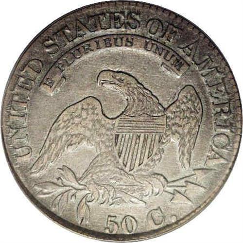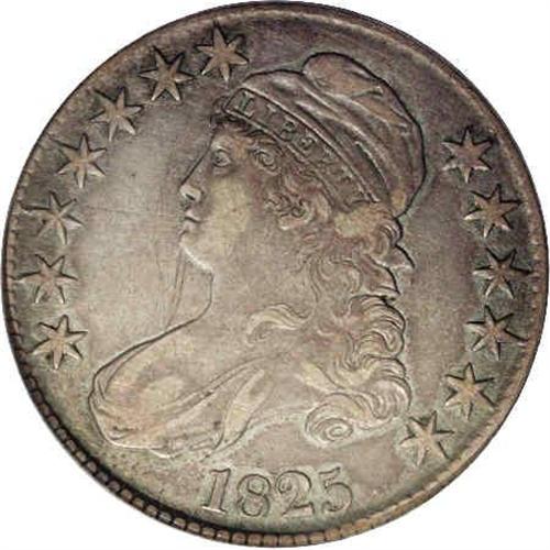 <B>1825<50C> VF20--Obverse Scratched--NCS. VF Details.</B></I> O-109, R.5. A second occurrence of this rare Overton variety. Key pickup points for attributing this rare variety are all present: extra large A's, the curl in the 2 points toward the I in LIBERTY, and I in E PLURIBUS UNUM lies directly beneath the juncture of A and T of STATES. After conservation a number of scratches are still noticeable. The most obvious two run from Liberty's chin down toward her bustline, almost as though someone were trying to create a Bearded Goddess variety (which dates from 1807). But the scratches are neither prominent nor distracting, requiring a loupe to see easily. A few other obverse scratches are even less prominent. On a positive note, much detail remains that approaches the XF level, if not attaining it, and the coin retains its fair share of eye appeal. Another excellent opportunity for Bust half specialists.<BR><I>Ex: Colonial Coin (9/1/1981).</B></I> Envelope Included.