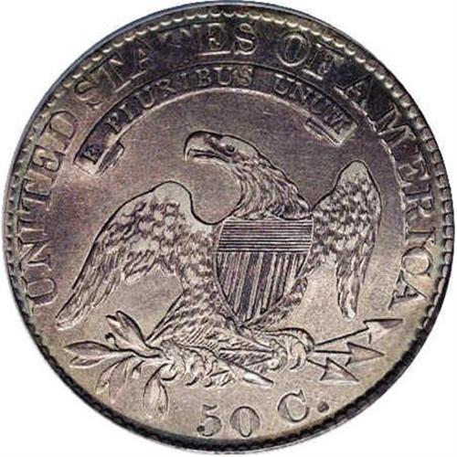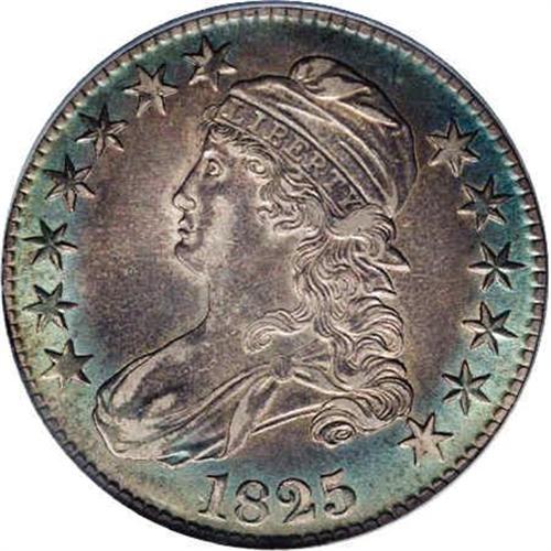 <B>1825<50C> XF40--Improperly Cleaned--NCS. AU Details.</B></I> O-116, R.3. This variety shows a curl of hair that extends back onto Liberty's headband. On the reverse, an extra tine of metal extends from the left of the scroll, and a thin line connects claws 1 and 2. After conservation this specimen shows glossy gray surfaces that blend into deep sky-blue at the obverse margins, although the reverse has less color, with a splash of copper, and a more flat, unnatural luster. The strike is bold but uneven, with the right sides of obverse and reverse considerably stronger than the left sides.<BR><I>Ex: George Ramont (3/1971).</B></I> Envelope Included.
