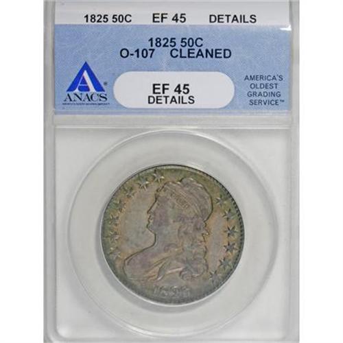 <B>1825 50C --Cleaned--ANACS. XF45 Details.</B></I> O-107. NGC Census: (65/2463). PCGS Population (75/617). Mintage: 2,900,000. Numismedia Wsl. Price for NGC/PCGS coin in XF45: $205. (#6142)<BR><BR><B>Coin Engraver:</B> John Reich<BR><BR><b>Shipping:</b> Coins & Currency (<a target="_blank" href="http://www.heritageauctions.com/common/shipping.php">view shipping information</a>)