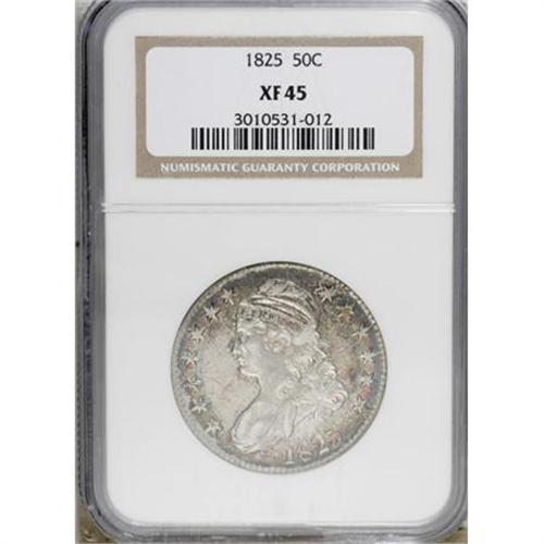 <B>1825 50C XF45 NGC.</B></I> NGC Census: (65/2460). PCGS Population (75/614). Mintage: 2,900,000. Numismedia Wsl. Price for NGC/PCGS coin in XF45: $138. (#6142)<BR><BR><B>Coin Engraver:</B> John Reich<BR><BR><b>Shipping:</b> Coins & Currency (<a target="_blank" href="http://www.heritageauctions.com/common/shipping.php">view shipping information</a>)