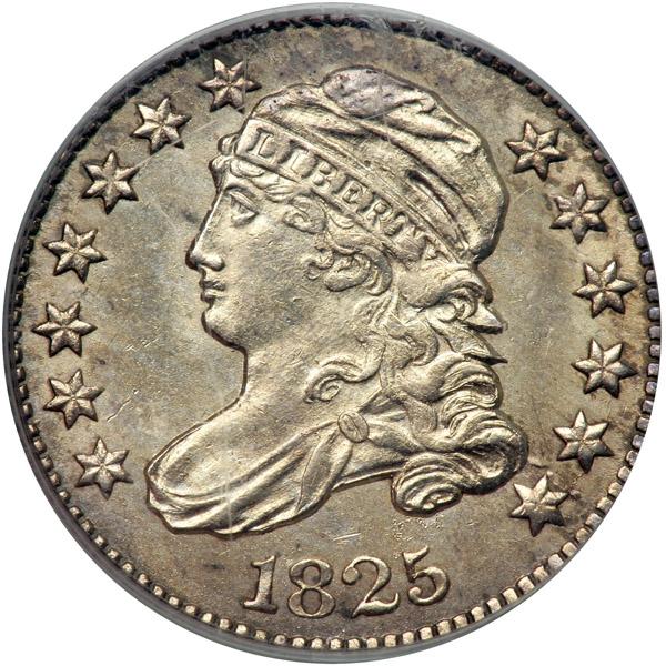 1825. PCGS graded MS-62 CAC Approved. Frosty and untoned. This has a modest number but has nicer appearance than most collectors realized. It is predicated on the overall choice fields and devices. We don't think this will sell for a discount; so don't be surprised to see a strong final bid realized. In an OGH. Pop 11; 26 finer (PCGS # 4503) .