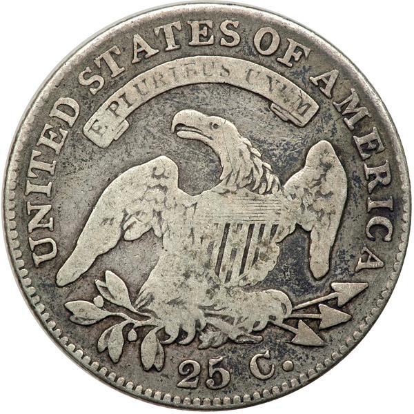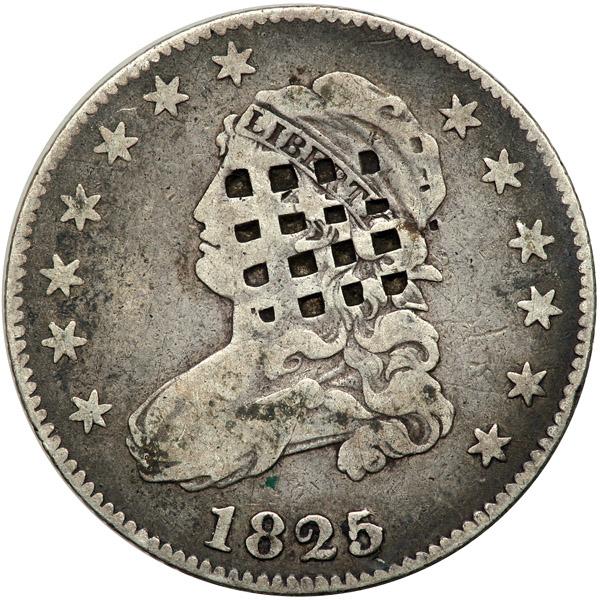 1825 Bust Quarter with unusual counterstamp pattern. Sharpness of Fine with unusual man-made pattern counterstamped on the obverse.