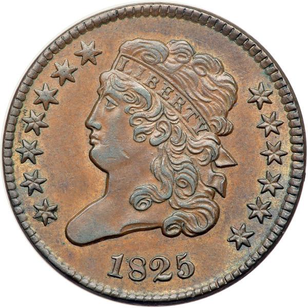 1825 C-2 R1 AU50+. Beautiful lustrous brown and light chocolate with slightly darker steel brown toning on the highpoints. A subtle splash of slightly darker bluish steel and light olive toning covers ATE in STATES. Satiny luster covers the fields on both sides. Very close to AU55, and it was graded MS60+ by Roger S. Cohen, Jr., in 1983. The only mark is a tiny nick in the center of the jawline. Nicely struck EDS, Manley state 1.0. The end of the wreath stem is sharp, a die state called "very scarce" by Manley. In addition, there is a sharp, clearly defined bar on the rim between stats 10 & 11. This bar is often found on examples of the variety, and it may have been caused by a break or notch in the striking collar. Noyes photo #74355.