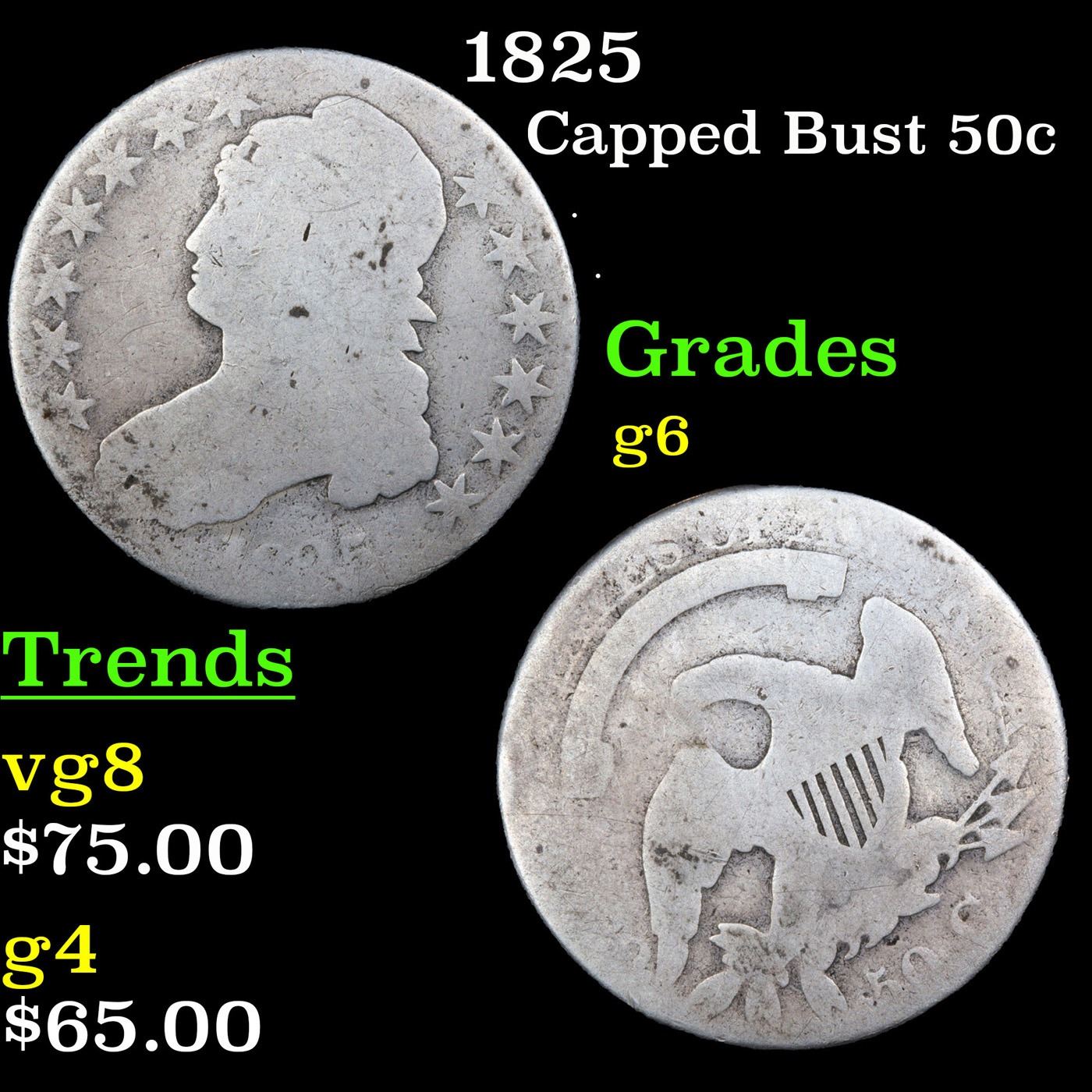 1825 Capped Bust Half Dollar 50c Grades g+.