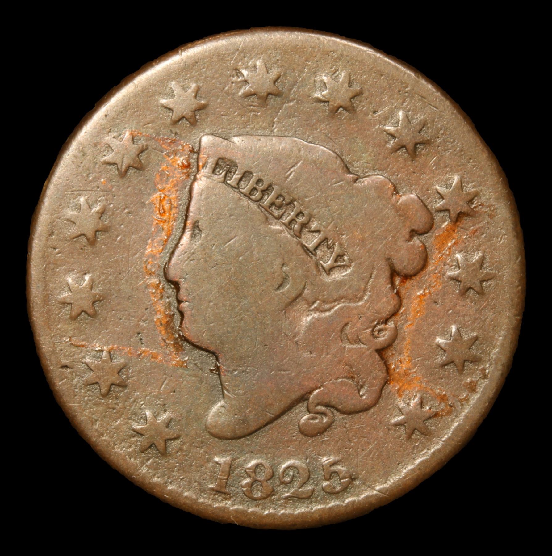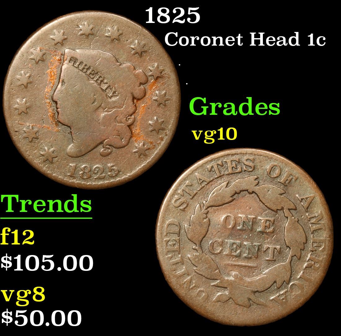 1825 Coronet Head Large Cent 1c Grades vg+.