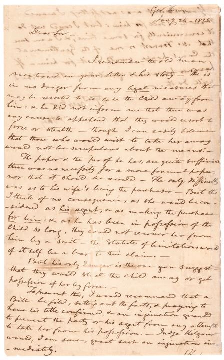 “I remember the old man mentioned in your letter & his story – He is in no danger from any legal measures that may be resorted to to take the child away from him: & he did not inform me that there was any cause to apprehend that they would resort to force or stealth – though I can easily believe that those who would wish to take her away would not be scrupulous about the means.