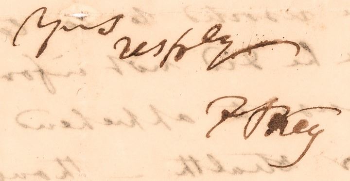 January 24, 1825-Dated, Slavery Related Autograph Letter Signed, “F.S. Key,” 1.25 pages, measuring 7.5” x 12.5”, front & verso, at George Town, Choice Very Fine. Integral mailing leaf is also addressed by Key to, “Mr Jas. P. Stabler / P.M. / Sandy Spring / Montg[omer]y Co[un]ty Maryland.” Faint “Georgetown D.C. Jan 25” postmark. Minor flaws, minor fold splits and some loss on the blank mailing leaf and expertly strengthened at folds using archival silk. Ten years after writing his “The Star-Spangled Banner” waving o’er the land of the free, lawyer Francis Scott Key assures a Maryland Post Master that a young Slave, duly purchased by a friend, is in no danger of being legally taken away. This Handwritten Francis Scott Key Slavery related Letter reads, in full;