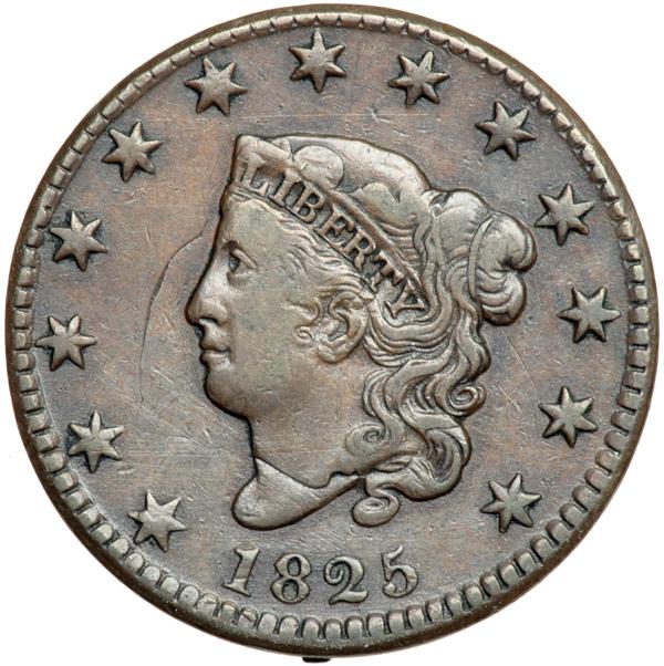1825 N-10 R3 F15. Double Struck over Off Center Obverse Brockage. Five points sharper with a rim nick at S-O, some light contact marks around CEN, and faint hairlines on the lower half of the obverse. Glossy chocolate brown. The obverse is double struck, both impressions properly centered and the second rotated 90 degrees clockwise relative to the first. Much of the initial strike remains clear, especially the top of the head in the field before the face and the profile along the bottom of the bust. The initial reverse strike was a 25% off center obverse brockage. An arc of impressed dentils passes from the AT in STATES down to the second A in AMERICA. In addition, there are some incuse stars visible above and below the C in CENT, on the wreath ribbon, and inside the C in AMERICA. Additional traces of incuse undertype can be found with some effort. E-MDS. DWH #1885.