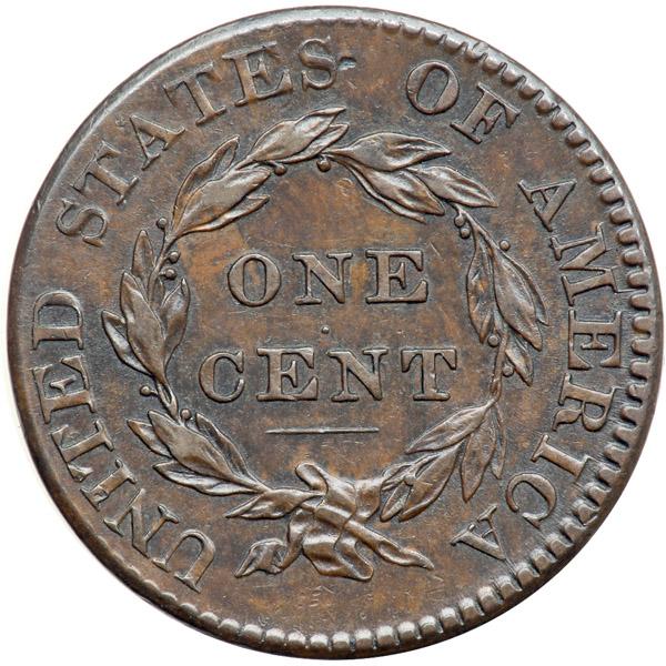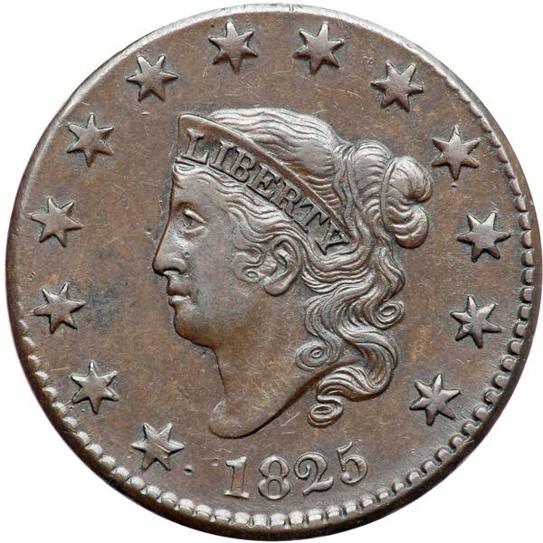 1825 N-3 R3 VF30. Very attractive glossy medium chocolate brown with satiny mint frost peeking through in protected areas on both sides. The surfaces are perfectly smooth, free of any hint of corrosion or verdigris. The only notable mark is a small, dull nick just right of the second S in STATES. LDS. The small die chip (lump on the coin) is still visible under star 6, and there are fine die cracks from the curl at star 13 to the top of the 5 and another from the bust tip into the field toward the dentils under star 1. Both cracks are very light. In addition there is a very thin double profile (from die bounce) on the chin, lips, and nose. Quite nice for the grade offering excellent eye appeal.