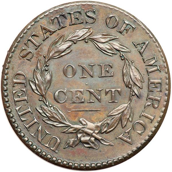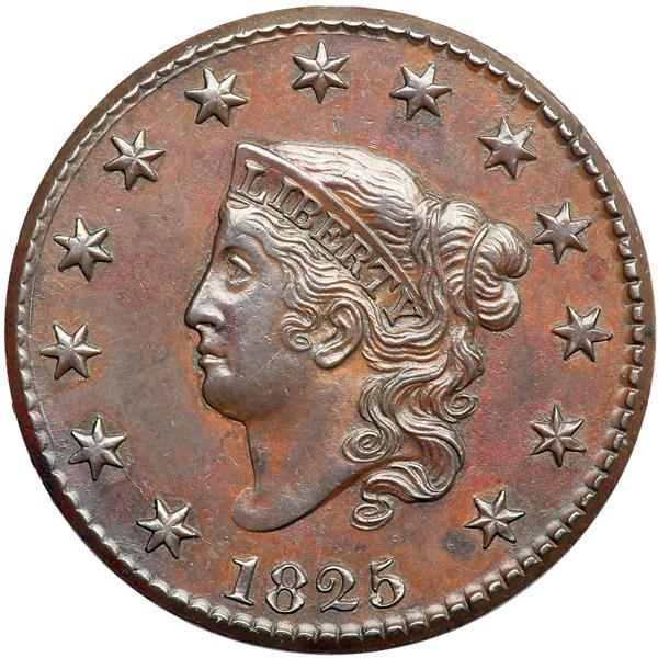 1825 N-4 R3. PCGS graded MS-62 Brown. The obverse is glossy reddish chocolate brown, the reverse a glossy light olive brown. A very faint hairline slants across the jaw and a dull one shows on the bust, neither visible without a strong glass. MDS. Fine die cracks connect all the stars except for #10 and a stronger die crack passes through the bases of RICA to the stem and ribbon. Called AU55 and tied for CC#2 in the Bland census. Noyes says AU55 net AU50 and tied for CC#4, his photo #27554. Either way this is an important cent, and it comes with an impressive provenance. Our grade is AU50. Pop 1; 1 in 64. Only 2 examples graded at PCGS for the variety. DWH #1905 (PCGS # 36793) .