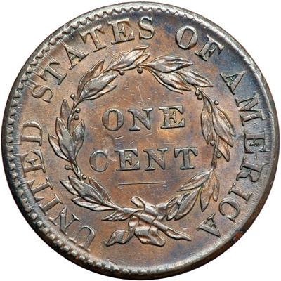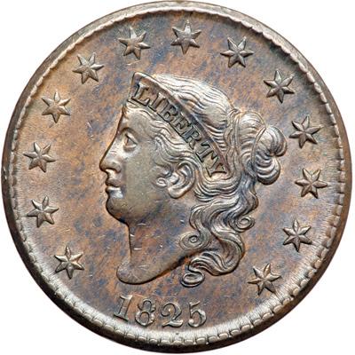 1825 N-6 R3. PCGS graded AU-55. Lustrous steel brown and chocolate with traces of lighter steel brown faded down from mint color in protected areas. The toning on the obverse is delicately mottled and there is a shallow low spot (from debris on the die) under the O in ONE. Otherwise this cent is choice and it offers outstanding eye appeal for the grade. LDS with fine die cracks on both sides. Previously removed from an ICG slab graded AU58 (ICG label included). Our grade is AU50.