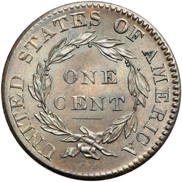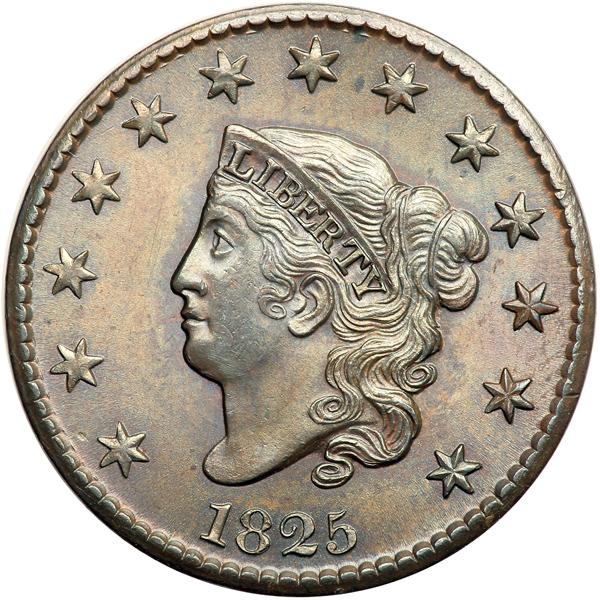 1825 N-6 R3. PCGS graded MS-64 Brown. Attractive lustrous light steel brown with delicate overtones of bluish steel in the protected areas and hints of underlying very faded mint color remaining on the obverse. The surfaces are satiny and show only a few minor marks. These include a faint hairline scratch in the field right of star 2, a very light scuff on the chin, two specks of darker toning between stars 7 & 8, a tiny nick on the nostril, and some very fine carbon inside the first A in AMERICA. M-LDS. The reverse center dot is gone, a faint die crack meanders from the leaf over O in ONE through the N and down to the N in CENT, and the reverse is rotated 40 degrees CCW. Nicely struck with excellent eye appeal. Removed from an NGC slab graded MS65BN (NGC label included, and the label shows the attribution). Our grade is MS60.Pop 2: None finer. Only 3 examples graded at PCGS for the variety. DWH #2643 (PCGS # 36796) .