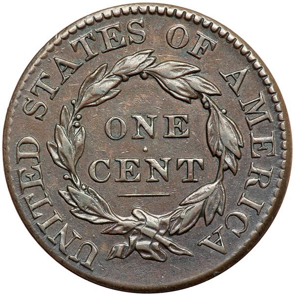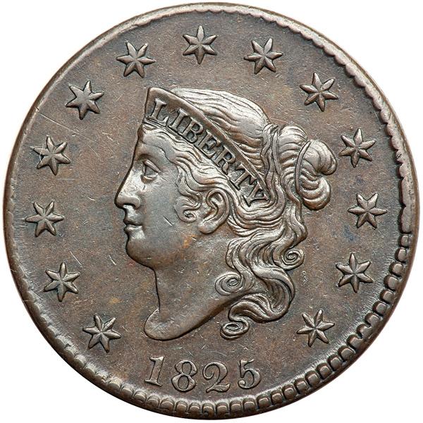 1825 N-7 R3 EF40. Repunched 5. EF-40. Attractive glossy chocolate brown. Smooth surfaces that are nearly free of marks. A very light diagonal hairline scratch between stars 4 & 5 is the only notable mark, and it is barely visible. MDS. A fine but clear die crack reaches from the curl at star 13 down to the dentils just right of the date and rim crumbling shows at star 11 up nearly to star 10. The repunching on the 5 is sharp. Called VF35 Choice in the Noyes census, his photo #26819. Removed from an NGC slab graded AU58 (NGC label included, and it shows the attribution and Reiver provenance). DWH #3223.