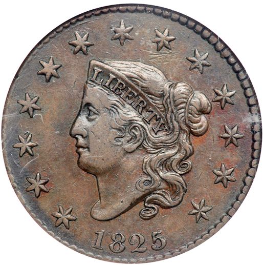 1825 N-7 R3 Repunched 5. NGC graded EF-45. Very attractive glossy chocolate brown blending to olive brown in protected areas. The surfaces are smooth and there are very few signs of contact. These include a tiny pinprick nestled against the top of star 3 and a collection of ticks under star 8. Sharply struck EDS, prior to the die crack down from the lowest curl. The repunching on the 5 is sharp. Our grade is VF30 choice. The attribution and Reiver provenance are noted on the NGC label.