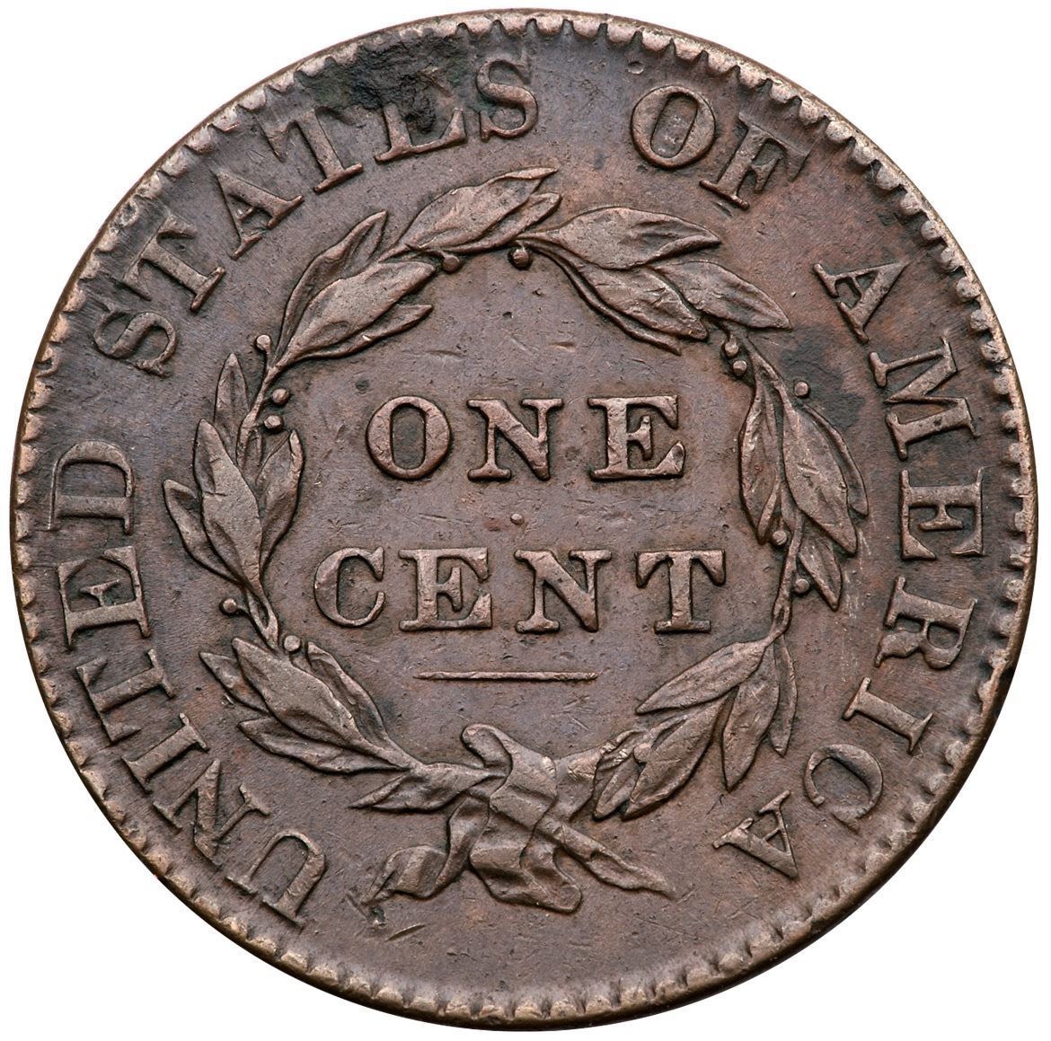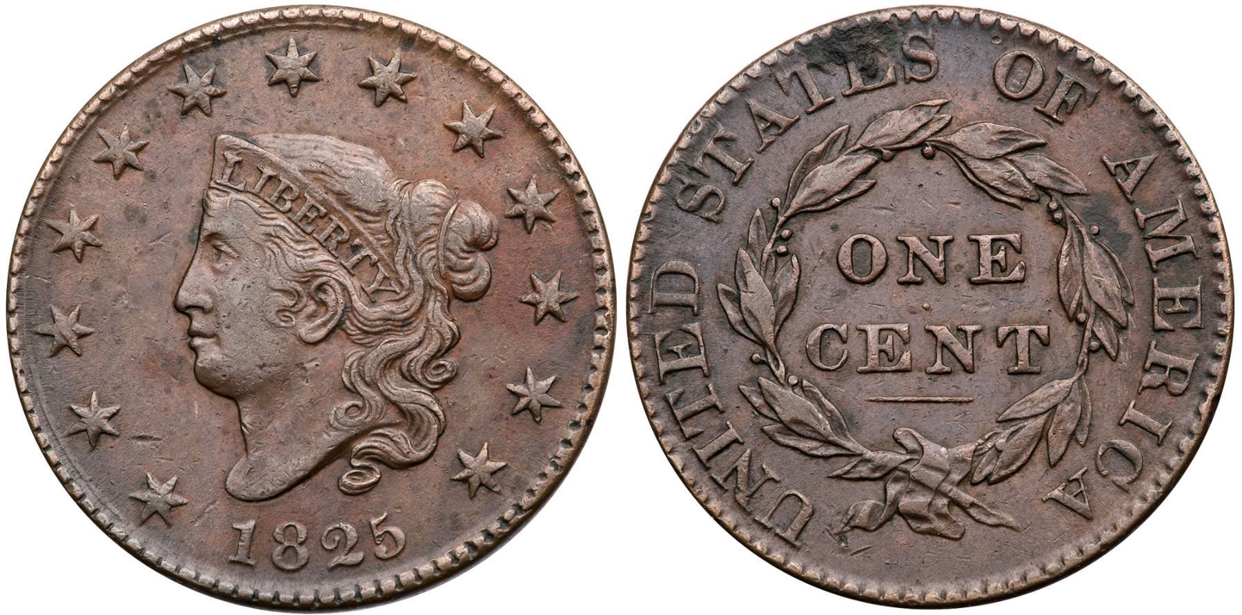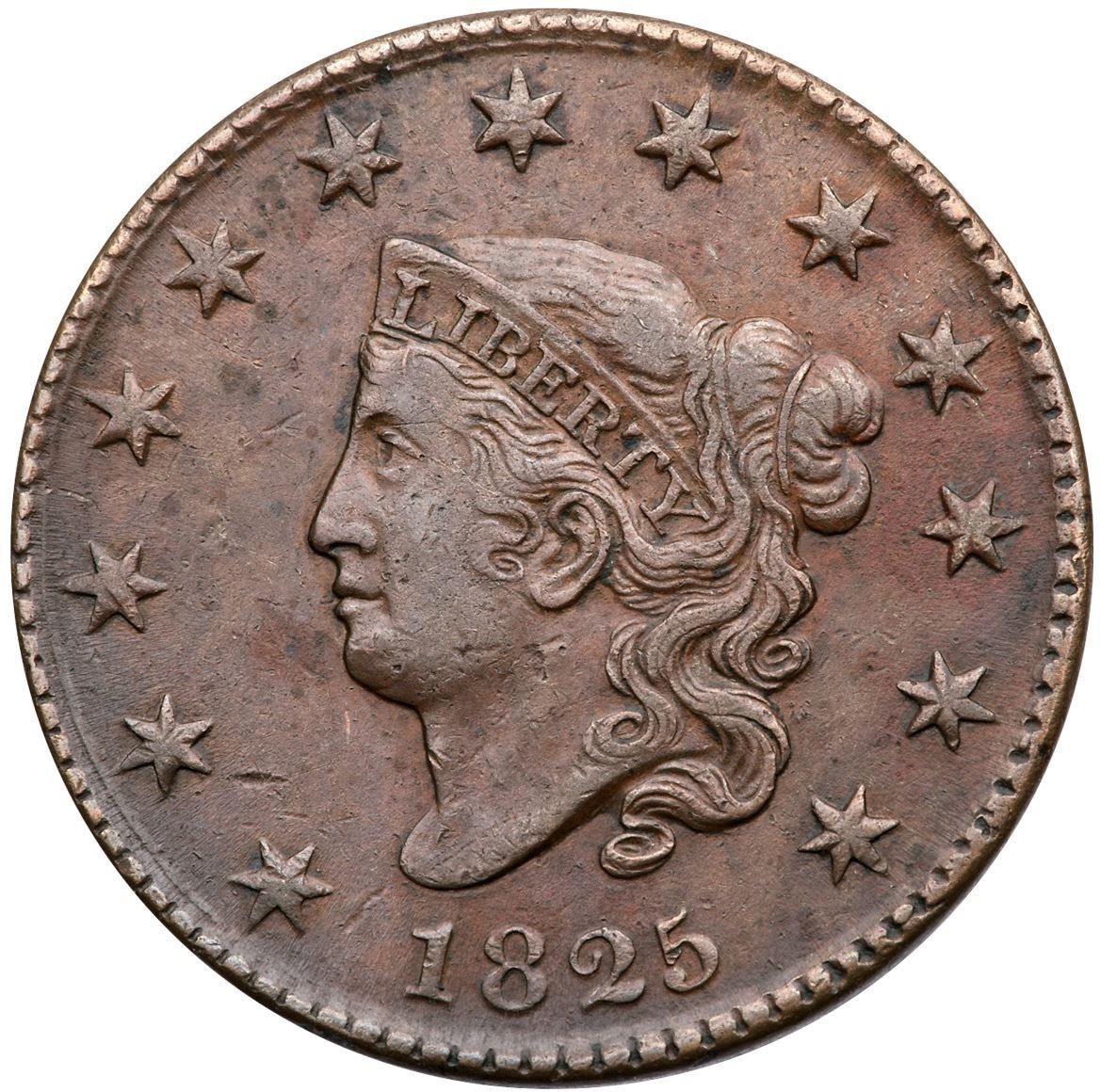 1825 N-8 R-2 VF25VF35 sharpness but there is old verdigris over TES in STATES and a few dark spots on the obverse and under AM in AM in AMERICA. There are some trivial marks, one right of star 2 and and one under the ribbon tail. Olive and steel browns with ruddy brown underneath.Certificate Number: Pedigree: Ex; Bob Patchin - Dennis Fuoss