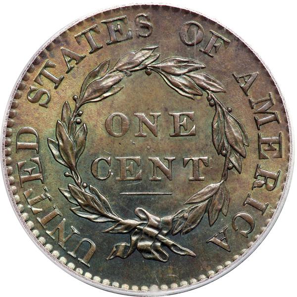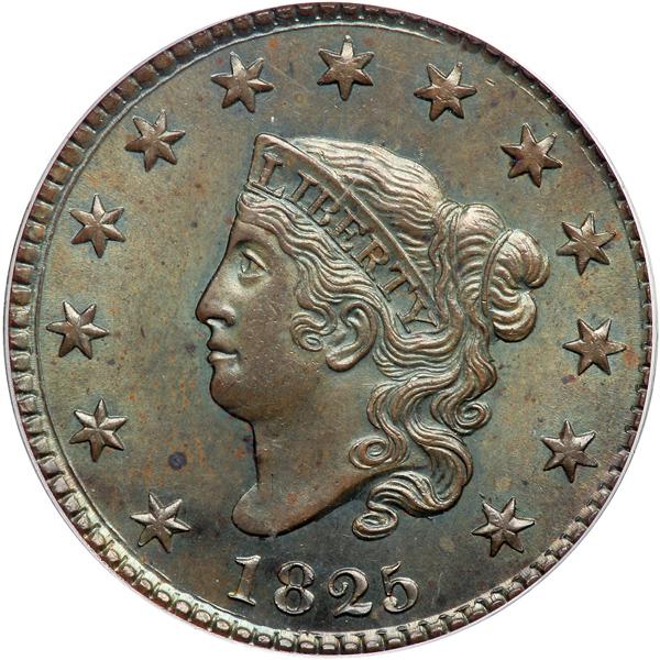 1825 N-8 R3+ PCGS graded MS64 Brown. PCGS graded MS-64 Brown. Very attractive highly lustrous light olive and sea green. Great eye appeal for the grade. The only marks are a small spot of darker toning in the field over star 1 and a microscopic nearly horizontal hairline close under the E in CENT. Nicely struck EDS with crisp dentils around both sides and clear inner circle segments around the obverse. Most but not all of the stars show radial lines. The obverse die is uncracked and there is no trace of crumbling at the dentil roots around star 12. Struck very slightly off center to K-3. Called MS63 and tied for CC#2 in the Noyes census, his photo #20548. Bland says MS60+ and tied for CC#3 among the confirmed examples. Our grade is MS63. Pop 1; 1 in 66. Only 2 graded at PCGS for the variety. DWH #3536.