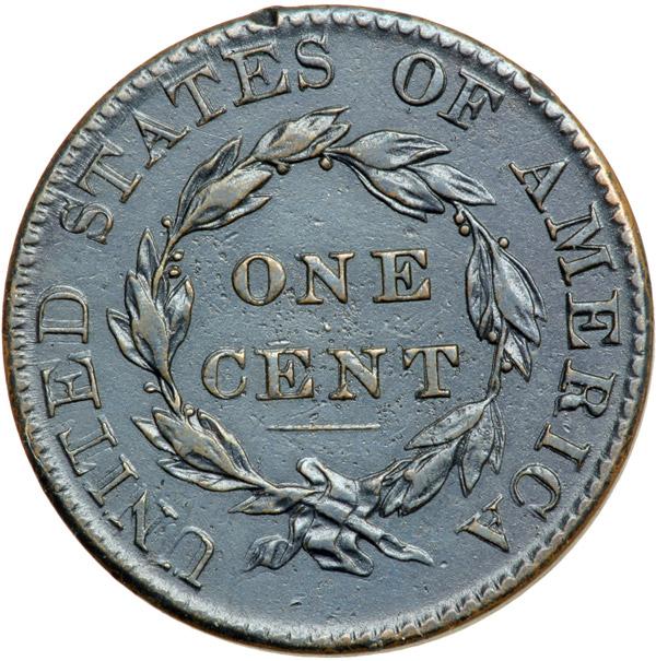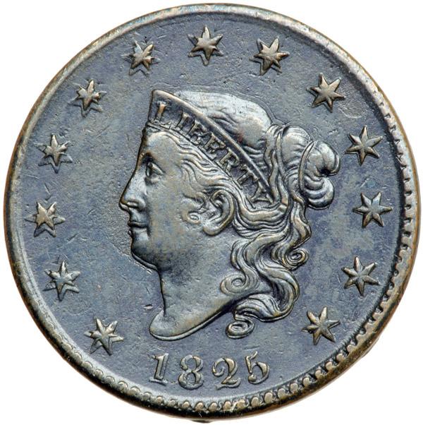 1825 N-8 R3 VF25. Double Struck. Ten points sharper but there are traces of extremely fine roughness on both sides and a rim nick over the E in STATES. No verdigris or additional defects. Rather glossy dark olive and steel with steel brown toning on the high points. Double struck with a small offset between impressions, about the width of a dentil. The doubling is clear and easily visible, and the offset is greater on the left half of both the obverse and reverse. MDS.