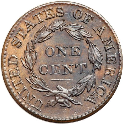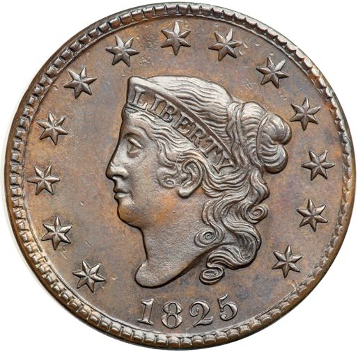 1825 N-9 R2 EF45+. Glossy chocolate and dark steel brown with frosty lighter brown and tan toning in protected areas, especially on the reverse. Satiny mint luster shows through in the fields and protected areas on both sides. The only marks are a tiny, dull tick at the dentil tips under star 13 and a few more on the bottom of the reverse under the wreath. A very attractive cent, close to AU50. MDS showing fine die rust in the field between the nose and star 3 plus more at ATES-OF.