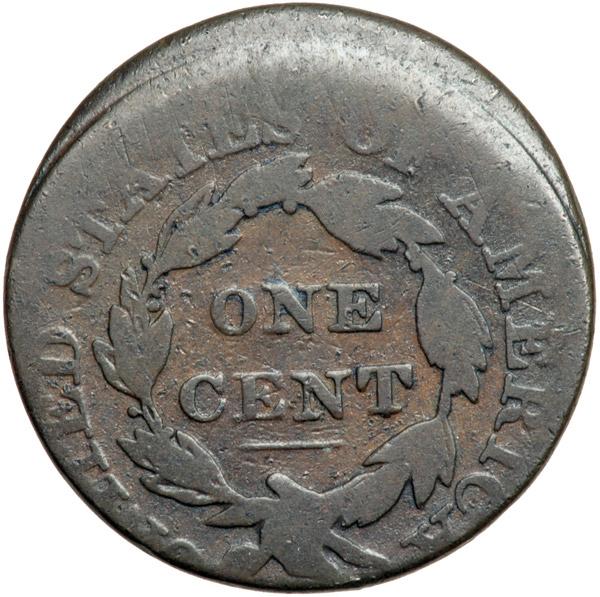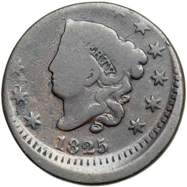 1825 N-9 R2 G5. Off Center. Glossy chocolate brown with traces of frosty lighter brown in protected areas. Smooth and attractive for the grade, just well worn. Struck 10% off center to K-11. The date is bold and the legends are readable. DWH #3290.