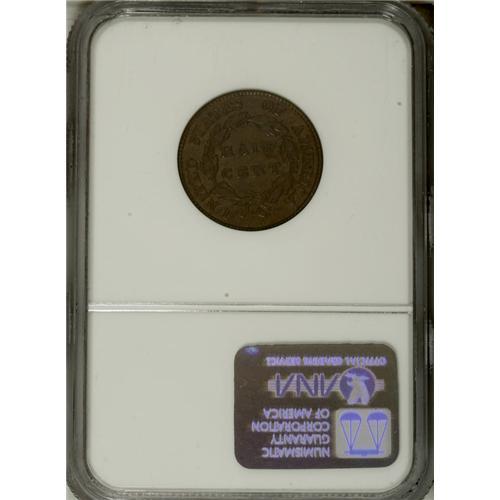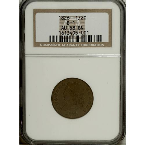<B>1826 1/2 C AU58 NGC.</B></I> B-1. NGC Census: (36/79). PCGS Population (23/64). Mintage: 234,000. Numismedia Wsl. Price: $258. (#1144)<BR><BR><b>Shipping:</b> Coins & Currency (<a target="_blank" href="http://www.heritageauctions.com/common/shipping.php">view shipping information</a>)