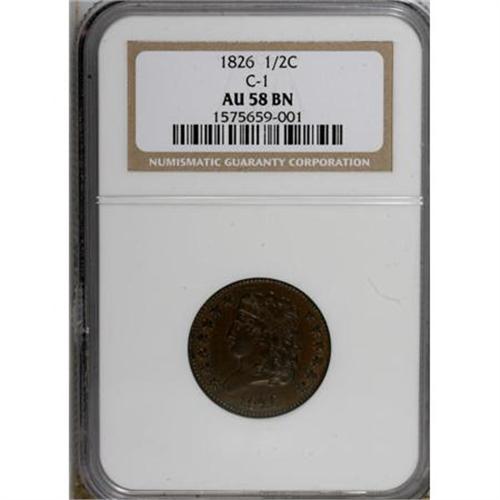 <B>1826 1/2 C AU58 NGC.</B></I> C-1. NGC Census: (37/80). PCGS Population (24/66). Mintage: 234,000. Numismedia Wsl. Price for NGC/PCGS coin in AU58: $258. (#1144)<BR><BR><B>Coin Engraver:</B> John Reich<BR><BR><b>Shipping:</b> Coins & Currency (<a target="_blank" href="http://www.heritageauctions.com/common/shipping.php">view shipping information</a>)