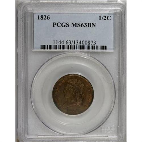 <B>1826 1/2 C MS63 Brown PCGS.</B></I> PCGS Population (28/27). NGC Census: (12/27). Mintage: 234,000. Numismedia Wsl. Price for NGC/PCGS coin in MS63: $675. (#1144)<BR><BR><B>Coin Engraver:</B> John Reich<BR><BR><b>Shipping:</b> Coins & Currency (<a target="_blank" href="http://www.heritageauctions.com/common/shipping.php">view shipping information</a>)