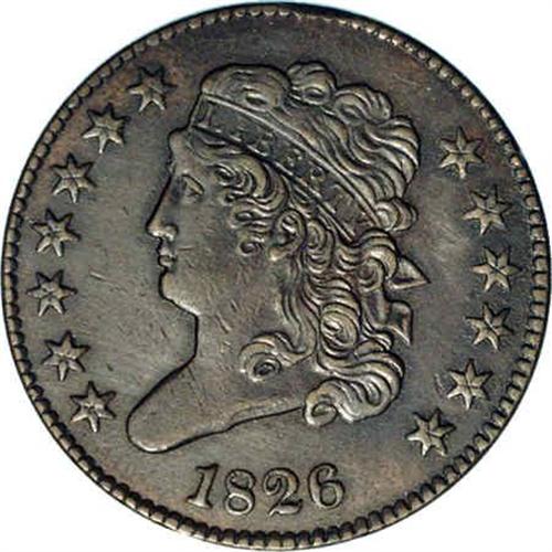 <B>1826<1/2 C> C-2, B-2, High R.3. Die State 2--Environmental Damage--NCS. AU Details. XF40 EAC.</B></I> 6 over horizontal 6; High leaf below center of S. Traces of the original 6 are still visible, but they are never bold on this variety. The digit 6 was initially punched lying on its back, and then repunched upright. This is mostly visible to the right of the knob and lower curve of the final digit, and it is seldom visible on lower grade examples. Die wear or use does not play a role in the reduced visibility of the date blunder, as will be seen in the next lot. Few examples of the 1826 Cohen-2 variety are known in Mint State, probably not more than four or five. Breen listed five Mint State examples but continued to say that four of the five had not been seen by him. Most recently, Bill Noyes recorded five Mint State specimens. Even that figure may be optimistic. Although this steel and golden-brown example is clearly not Mint State, it is not that far away, and is an important coin for specialist collectors. A few light abrasions are noted, and the surfaces have minor verdigris and localized corrosion, much of which can be removed or diminished with the proper care and conservation techniques. Envelope Included.