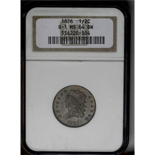 <B>1826<1/2 C> MS64 Brown NGC.</B></I> C-1, B-1, R.1. Traces of original color appear at the periphery, while the rest of the surfaces have mellowed to walnut-brown. Choice and sharply struck for this issue. EAC 55.