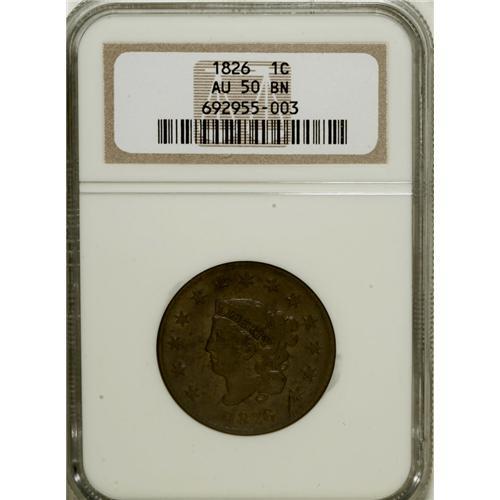 <B>1826 1C AU50 NGC.</B></I> NGC Census: (16/230). PCGS Population (5/60). Mintage: 1,517,425. Numismedia Wsl. Price for NGC/PCGS coin in AU50: $300. (#1645)<BR><BR><b>Shipping:</b> Coins & Currency (<a target="_blank" href="http://www.heritageauctions.com/common/shipping.php">view shipping information</a>)