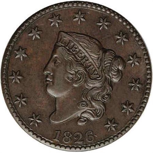 <B>1826<1C> N-1, Low R.2. AU55 NGC. XF 40 EAC.</B></I> Early Die State. The variety is confirmed by two dashes after the 6 in the date, and the close date with the 1 slightly low. The rim break over star 6 that is characteristic of a later die state has not yet developed. Medium brown surfaces yield a semi-gloss sheen, and display nicely centered and sharply defined design features. There are no serious contact marks to report.<BR><I>Ex: George Ramont (8/1980).</B></I> Envelope Included.