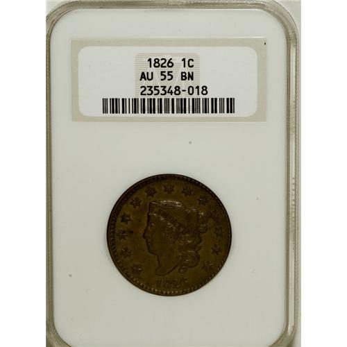 <B>1826 1C AU55 NGC.</B></I> NGC Census: (28/192). PCGS Population (11/44). Mintage: 1,517,425. Numismedia Wsl. Price for NGC/PCGS coin in AU55: $400. (#1645)<BR><BR><b>Shipping:</b> Coins & Currency (<a target="_blank" href="http://www.heritageauctions.com/common/shipping.php">view shipping information</a>)