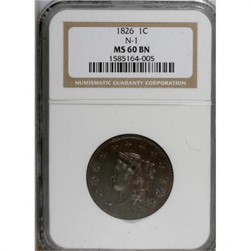 <B>1826 1C MS60 Brown NGC.</B></I> N-1. NGC Census: (0/69). PCGS Population (0/31). Mintage: 1,517,425. Numismedia Wsl. Price for NGC/PCGS coin in MS60: $600. (#1645)<BR><BR><B>Coin Engraver:</B> Robert Scot or John Reich<BR><BR><b>Shipping:</b> Coins & Currency (<a target="_blank" href="http://www.heritageauctions.com/common/shipping.php">view shipping information</a>)