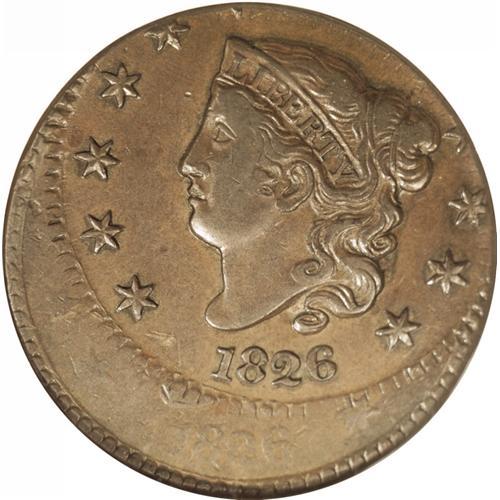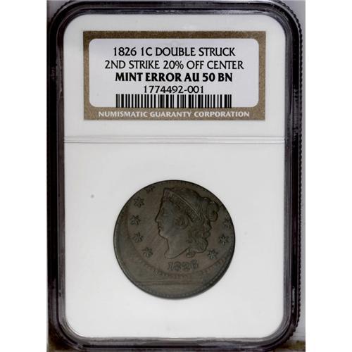 <B>1826<1C>--Double Struck With Second Strike 20% Off Center--AU50 NGC.</B></I> N-5, High R.2. Traces of the original, centered strike were not entirely obliterated by the second strike, which is off-center north-northeast by about 20%. The first, centered strike shows traces of stars 1 through 3 and star 13, as well as all four digits of the date. This pleasing medium brown coin shows a bit of highpoint wear, as expected, and a decent strike on the second off-center impression, with a few slight abrasions. EAC 25. <BR><BR><B>Important notice:</B> Heritage usually auctions material at the rate of 200-250 lots per hour. On some occasions eBay Live bid software or the Internet may not be able to keep up with the pace of the auction. We recommend placing a realistic absentee bid now as insurance to avoid disappointment. Occasionally the auctioneer may eliminate or reject an eBay Live bid, and the auctioneer may also reopen a lot after the close of the eBay live bidding (usually because we missed an audience bid), and may reject your bid even if it shows you as the winning bidder. By bidding via eBay Live, you agree that Heritage may award the lot to another bidder at its sole discretion under the circumstances described above or any other reasonable circumstances. Since eBay bids are not shown to us until we open the lot on the floor, we treat those bids just like floor bids. In most cases the floor responds before the eBay bid is presented to us, due to Internet lag time, so for consistency we have made it a policy that floor bids are always considered first over tie eBay live bids. Also please note that all Heritage lots purchased through eBay Live carry a 20% Buyer's Premium. Please make sure you read the Terms and Conditions before you bid. This lot is being auctioned in conjunction with a live floor auction by Heritage Galleries & Auctioneers. All final auction and invoice information will be supplied by Heritage Galleries & Auctioneers, and all other information should be considered preliminary. Lot:275 <BR><BR><B>Winning Notification and Billing:</B> After the FINAL session in this auction is complete, Heritage will send e-mail and snail mail invoices. This process normally takes several days. All final auction and invoice information will be supplied by Heritage Galleries & Auctioneers, and all other information should be considered preliminary. <BR><BR>This auction will be conducted on a live auction floor and over the Internet through eBay Live. If you choose to place an absentee bid, please take a moment to <font color='#0000ff'><u><a href='http://pages.ebay.com/liveauctions/help/before/laabsentee.html'>learn how eBay Live absentee bidding works</a></u></font><font color='#000000'>