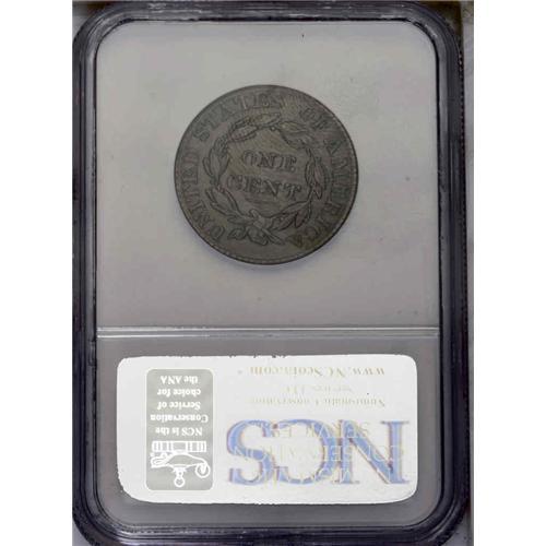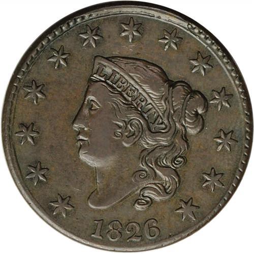 <B>1826<1C> N-6, R.2--Improperly Cleaned--NCS. AU Details. VF30 EAC.</B></I> Late Die State. The dentils are solidly merged over stars 6 through 8, and a faint crack is barely visible from the coronet tip to the top point of star 5. A double to triple profile occurs along portions of Liberty's face. The design elements are generally well defined and centered on the planchet. Lightly cleaned olive-tan surfaces are imbued with faint bluish undertones.<BR><I>Ex: Stack's (5/1968), lot 311; George Ramont (8/9/1977).</B></I> Envelope Included.