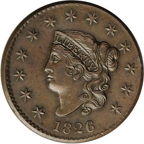 <B>1826<1C> N-9, R.3. MS61 Brown NGC. AU50 EAC.</B></I> Late Die State. A reverse die crack is visible through the left ribbon to the left edge of the knot, continuing between EN of CENT, and up to the right side of N in ONE. The surfaces have intermingled olive and light brown color and are pleasing for the grade. The design elements are sharply defined. A minor rim bruise is noted at 3 o'clock on the obverse, and a few minute marks occur on Liberty's cheek.<BR><I>Ex: George Ramont (3/25/1979).</B></I> Envelope Included.