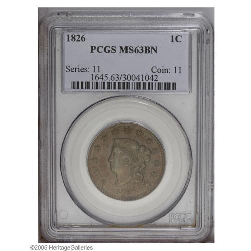 1826 1C MS63 Brown PCGS. N-5, High R.2. Die State C, w 1826[1C] MS63 Brown PCGS.
