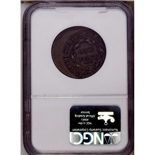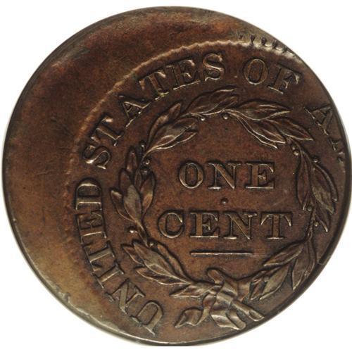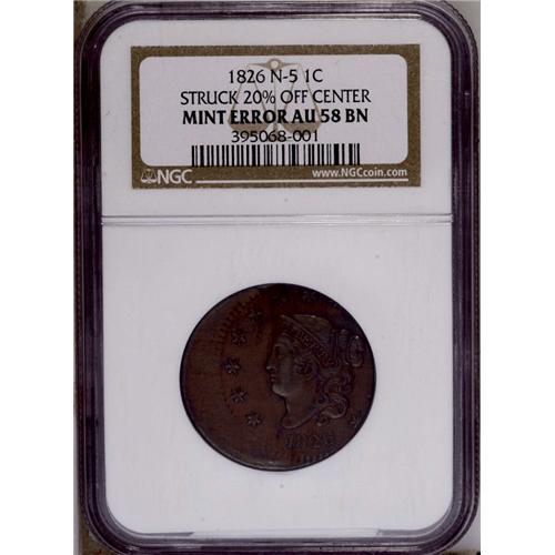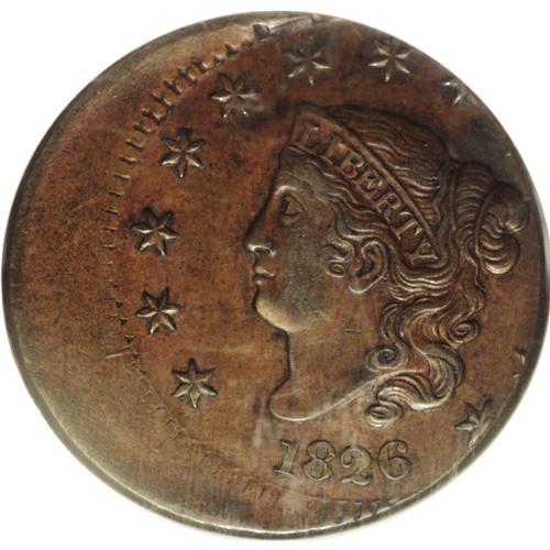 <B>1826<1C>--Struck 20% Off Center--AU58 NGC.</B></I> N-5, High R.2. Struck broadly off center toward 2:30. The portrait and wreath are completely on the flan, but a few stars and much of AMERICA are absent. Chocolate-brown color is consistent, and only a faint mark above the C in CENT can be detected. The cheek and forehead curl display a trace of wear. EAC 35.