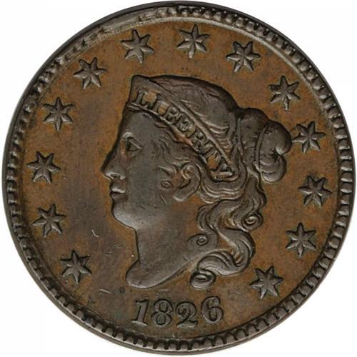 <B>1826<1C> N-5, High R.2. XF40 NGC. VF20 EAC.</B></I> Late Die State. Rim breaks are visible over star 4, and over stars 5 to 7. Medium tan-brown color bathes each side. Well centered, and no significant marks.<BR><I>Ex: George Ramont (12/3/1966).</B></I> Envelope Included.