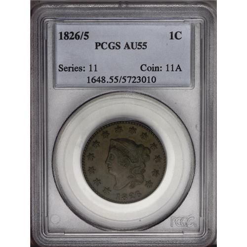<B>1826/5<1C> AU55 PCGS.</B></I> N-8, R.2. A glossy deep golden-brown cent with pleasing sharpness despite a hint of highpoint friction. The reverse is refreshingly smooth, and the obverse has only a few tiny ticks. Scarce in better circulated grades. EAC 40. Population: 3 in 55, 3 finer (6/06).