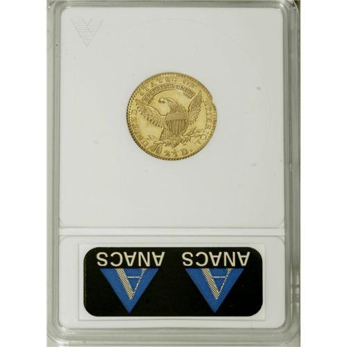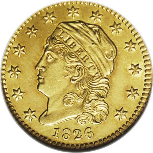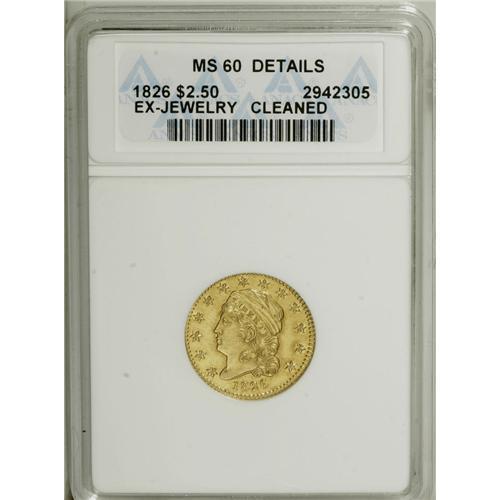 <B>1826/5 $2 1/2 --Ex-Jewelry, Cleaned--ANACS. MS60 Details.</B></I> Breen-6130, BD-1, High R.5. The 1826 quarter eagle is a fascinating issue. Part of the interest lies in the tiny mintage of only 760 pieces. In a series where attrition by melting wiped out most of the original mintages by 1834, the 1826 is considered a premier rarity. The two major grading services have only certified 20 coins in all grades (the finest being a pair of MS61s), which translates into probably only 12-15 individual pieces that have survived.<BR> The other interesting aspect of the 1826 is the ongoing controversy whether there is an overdate feature on these coins. The <I>Bass Sylloge</B></I> states: "This variety has traditionally been called an '1826/5' overdate, though its status as an actual overdate remains unconfirmed and dubious." When one examines the date it is easy to see why this has traditionally been considered an overdate. It appears that there is the remnant of the upper left corner of a 5 to the left of the 6. Apparently ANACS believes this as well. However, the dispute appears to have been solved 25 years ago when Akers published his auction survey series on U.S. gold. He wrote: "The known specimens of 1826 are certainly from a different obverse die than any known 1825 and this is most obvious by comparing the size of the stars. The stars are much larger on the 1826 than they are on the 1825. (Note: The stars on the 1821, 1824/1 and 1825 are all very small, while those on the 1826 and 1827 are relatively large.)<BR> The surfaces of this piece show obvious signs of cleaning at one time in the form of light hairlines. We do not see evidence of the Ex-Jewelry notation on the insert, so we assume it is on the edge of the coin. The fields are also bright and show traces of die striations which imparted much of the semi-reflective quality to the coin. Sharply struck throughout, the orange-gold surfaces show traces of light reddish patina around the stars and other devices. A rare opportunity to acquire this seldom-offered Capped Head Left quarter eagle, the rarest issue in the five date Large Diameter series from 1821 to 1827.<BR><BR><b>Shipping:</b> Coins & Currency (<a target="_blank" href="http://www.heritageauctions.com/common/shipping.php">view shipping information</a>)
