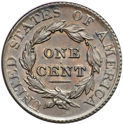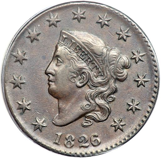 1826/5 N-8 R2 Overdate 6 over 5. ANACS graded AU-53. Choice lustrous chocolate and light olive brown with lighter brown tones in protected areas on the reverse. Satiny mint frost covers the fields and protected areas on both sides and this cent offers outstanding eye appeal. The only marks are a couple very tiny ticks at the bust tip, a few barely visible marks over star 4, and a short struck-through line (caused by a piece of wire or thread stuck on the die) hidden in the dentils over the first S in STATES. M-LDS. About half the dentils remain visible on each side and crumbling shows inside the top of the N in ONE. The top of the undertype 5 is clearly visible inside the top of the 6, but it has become dull from die wear. A premium example of this overdate variety. Our grade is EF40+ choice, very close to EF45. The attribution is noted on the ANACS label.