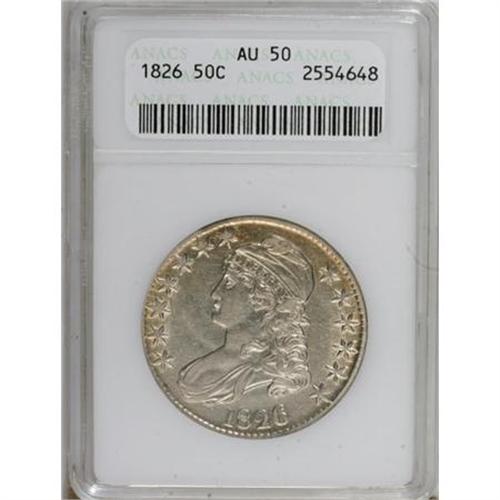 <B>1826 50C AU50 ANACS.</B></I> NGC Census: (57/871). PCGS Population (102/742). Mintage: 4,000,000. Numismedia Wsl. Price for NGC/PCGS coin in AU50: $221. (#6143)<BR><BR><B>Coin Engraver:</B> John Reich<BR><BR><b>Shipping:</b> Coins & Currency (<a target="_blank" href="http://www.heritageauctions.com/common/shipping.php">view shipping information</a>)