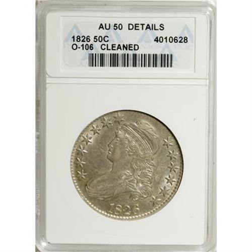 <B>1826 50C --Cleaned--ANACS. AU50 Details.</B></I> O-106. NGC Census: (57/871). PCGS Population (102/742). Mintage: 4,000,000. Numismedia Wsl. Price for NGC/PCGS coin in AU50: $221. (#6143)<BR><BR><B>Coin Engraver:</B> John Reich<BR><BR><b>Shipping:</b> Coins & Currency (<a target="_blank" href="http://www.heritageauctions.com/common/shipping.php">view shipping information</a>)