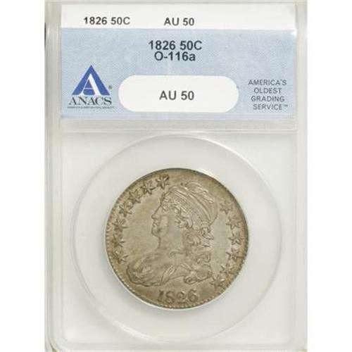 <B>1826 50C AU50 ANACS.</B></I> O-116A. NGC Census: (57/871). PCGS Population (102/745). Mintage: 4,000,000. Numismedia Wsl. Price for NGC/PCGS coin in AU50: $221. (#6143)<BR><BR><B>Coin Engraver:</B> John Reich<BR><BR><b>Shipping:</b> Coins & Currency (<a target="_blank" href="http://www.heritageauctions.com/common/shipping.php">view shipping information</a>)