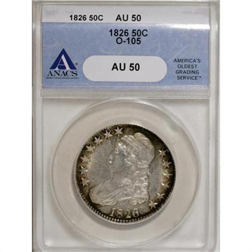<B>1826 50C AU50 ANACS.</B></I> O-105. NGC Census: (57/1146). PCGS Population (102/766). Mintage: 4,000,000. Numismedia Wsl. Price for NGC/PCGS coin in AU50: $340. (#6143)<BR><BR><B>Coin Engraver:</B> John Reich<BR><BR><b>Shipping:</b> Coins & Currency (<a target="_blank" href="http://www.heritageauctions.com/common/shipping.php">view shipping information</a>)