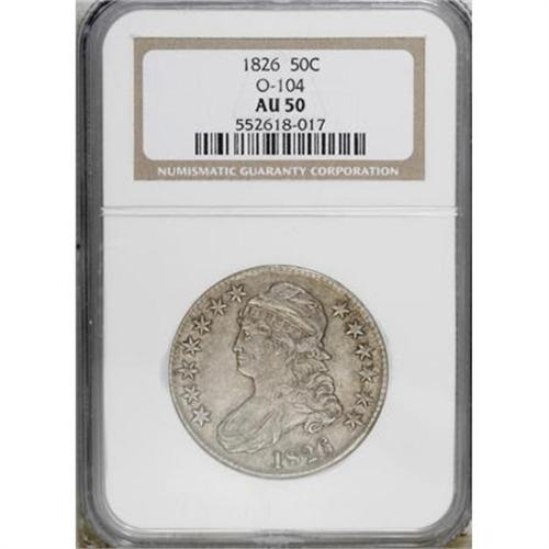 <B>1826 50C AU50 NGC.</B></I> O-104. NGC Census: (57/1103). PCGS Population (102/748). Mintage: 4,000,000. Numismedia Wsl. Price for NGC/PCGS coin in AU50: $221. (#6143)<BR><BR><B>Coin Engraver:</B> John Reich<BR><BR><b>Shipping:</b> Coins & Currency (<a target="_blank" href="http://www.heritageauctions.com/common/shipping.php">view shipping information</a>)